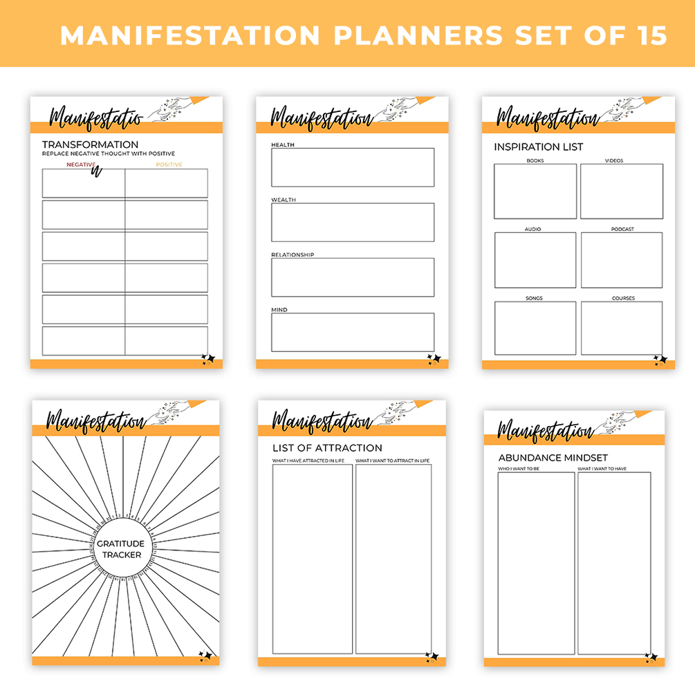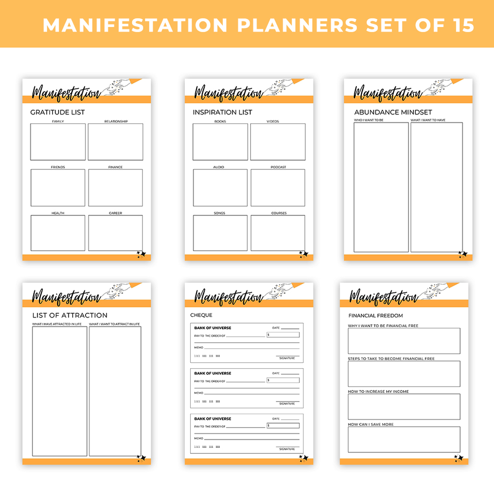 Elevate your manifestation journey with this set of 15 Canva manifestation planner templates designed to help you align your goals with the universe. Whether you're visualizing abundance, love, or personal growth, these beautifully crafted templates offer a serene and organized approach to manifesting your dreams. From daily intention setting to gratitude reflections, each template is meticulously designed to guide you through the manifestation process with ease and mindfulness. With customizable layouts and soothing aesthetics, Manifestation empowers you to create a harmonious space for manifestation and self-discovery. Start your journey towards manifesting your desires today with this exclusive set of planner templates.