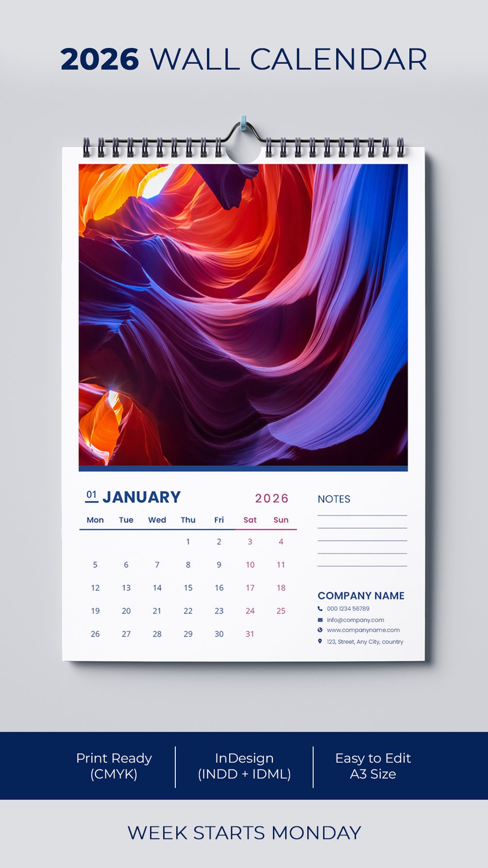 2026 Wall Calendar Template | A3 Size | Fully Editable InDesign (.INDD/.IDML) File