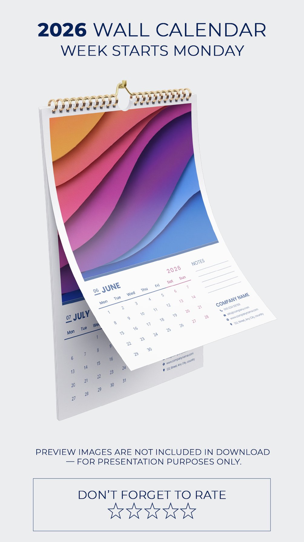 Immediately download and customize this professional, clean, and print-ready wall calendar template for the entire year of 2026. Perfect for corporate offices, small businesses, creative agencies, or as a sophisticated personal planner.